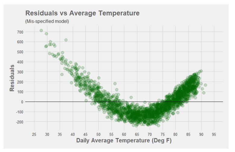 A simple regression line isn’t going to capture this nonlinearity, but I think this point is really driven home when we put average temperature on the right-hand side of our linear regression equation and then plot the residuals against temperatures.