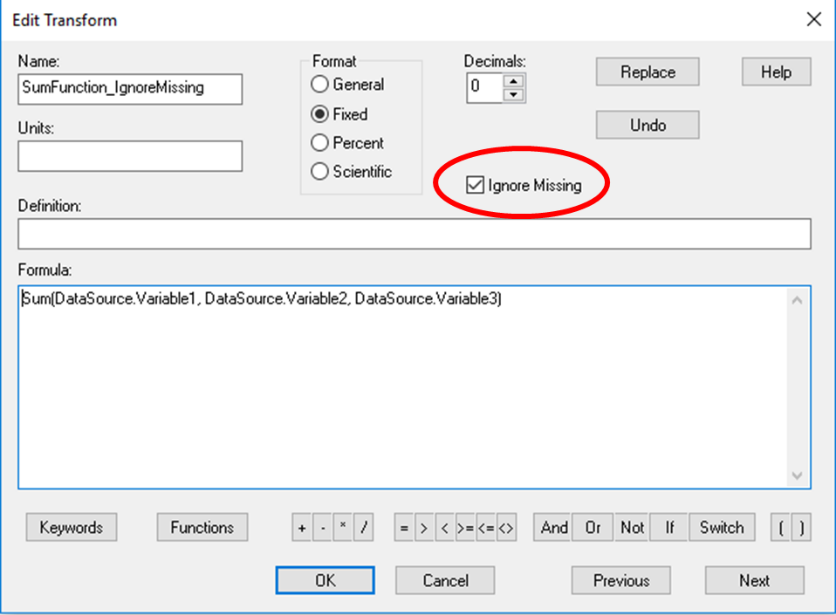 While the sum function behaves the same, the “Ignore Missing” option changes the behavior to produce a value. In other words, the sum function with the Ignore Missing option means a number plus a missing value equals a number.