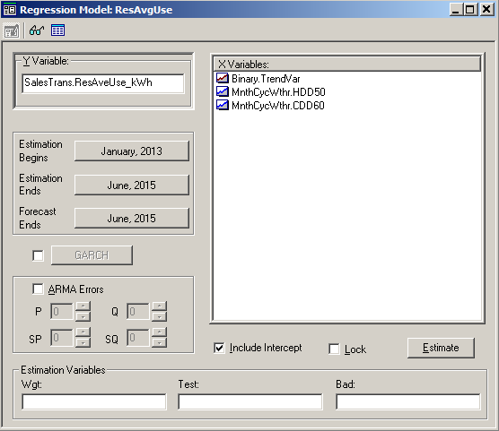 I’m using the Simulation Object in MetrixND to weather normalize historic sales. When configured, the object allows me to simulate the model replacing the X variables with a scenario. In weather normalization, the simulated X variables are the normal weather heating and cooling variables. My simulation is shown below.