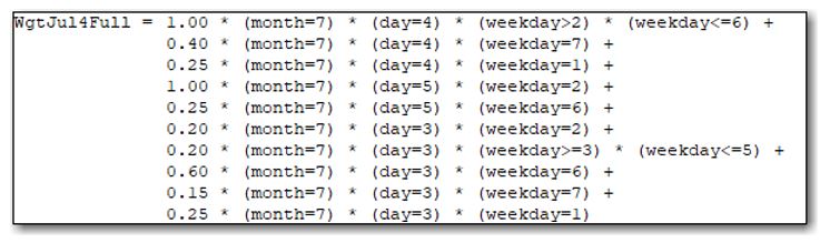 By specifying the weights in transforms, you can build complicated logic to address the issue. Further, a single variable that accounts for July 3, July 4 and July 5 can be a powerful way to address the problem of the holiday spillover effect along with the shifting weekday.